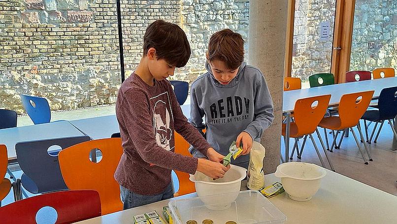 Nach einer Pause ging es an die Praxis. Vor der Zubereitung der Speisen wuschen sich alle die Hände und zogen bereitgestellte Küchenschürzen an. Anschließend bekamen die Mitwirkenden von Daniela Kugler zur Arbeit an mehreren Stationen genaue Anweisungen. Kreiert wurden ein grünes Pesto aus Kräutern, Käse und Sonnenblumenkernen, ein cremiger Tomatendip und eine Kräuterbutter, der ein längeres Schütteln frischer Sahne vorausging, um daraus Butter herzustellen.
