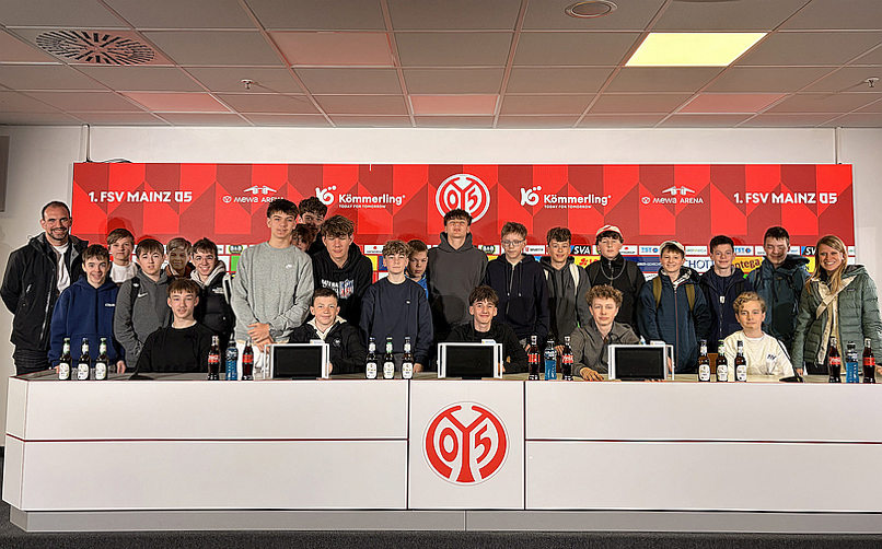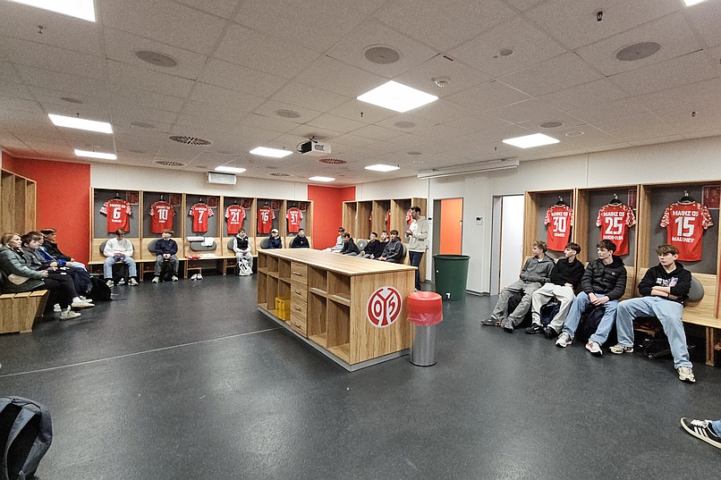 Im Rahmen unserer Kooperation 05ER Klassenzimmer war die 8c gemeinsam mit Frau Bartneck und Herrn Gottwald am 22.04.2026 zu Gast im Mainz‑05‑Stadion und durfte dort einen außergewöhnlichen Vormittag erleben. Den Auftakt bildete ein Workshop mit Marcel Friederich, einem ehemaligen Willigis‑Schüler, der mit seiner offenen, humorvollen und zugleich sehr ehrlichen Art sofort einen Zugang zu unseren Schülern fand.